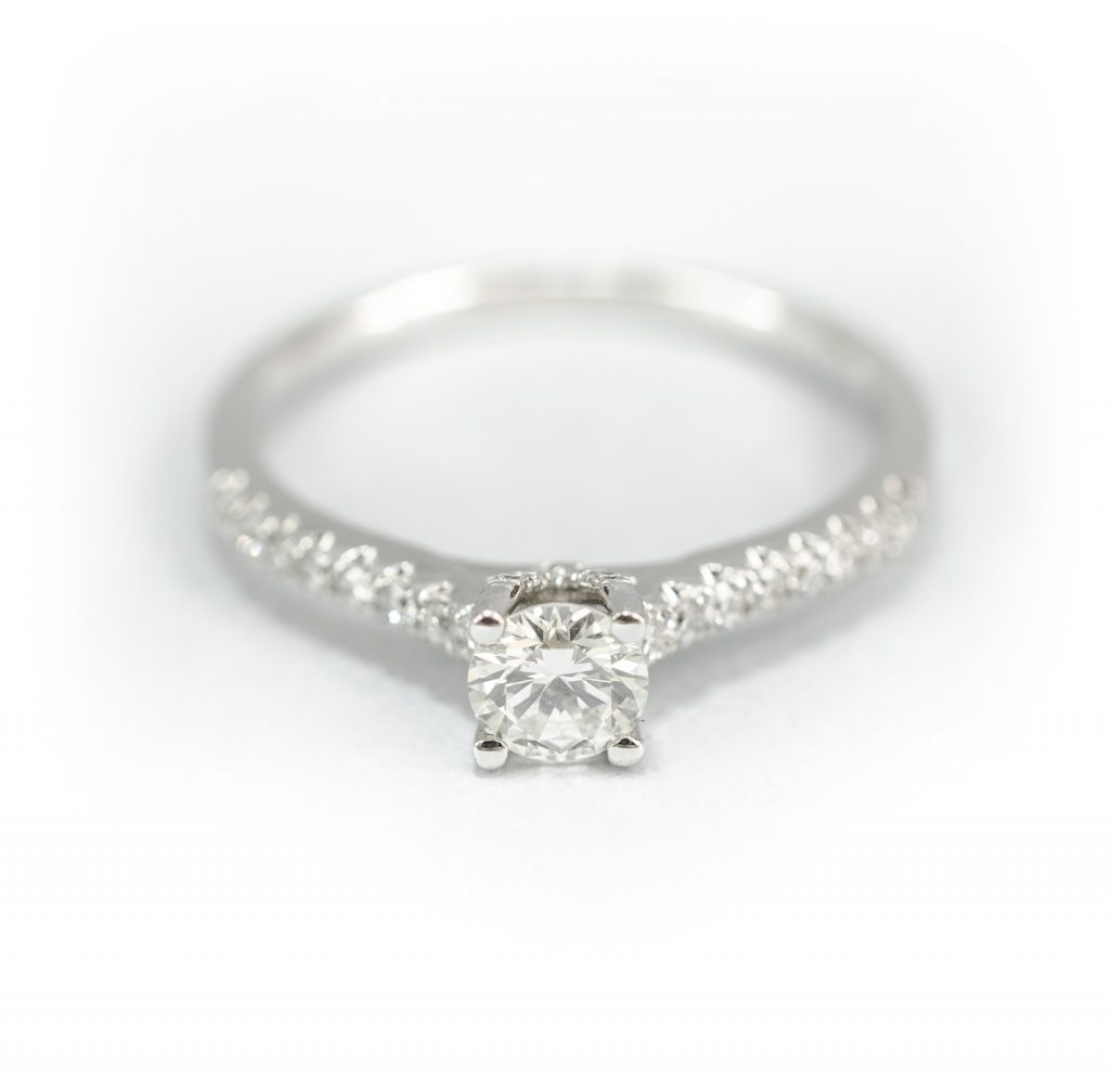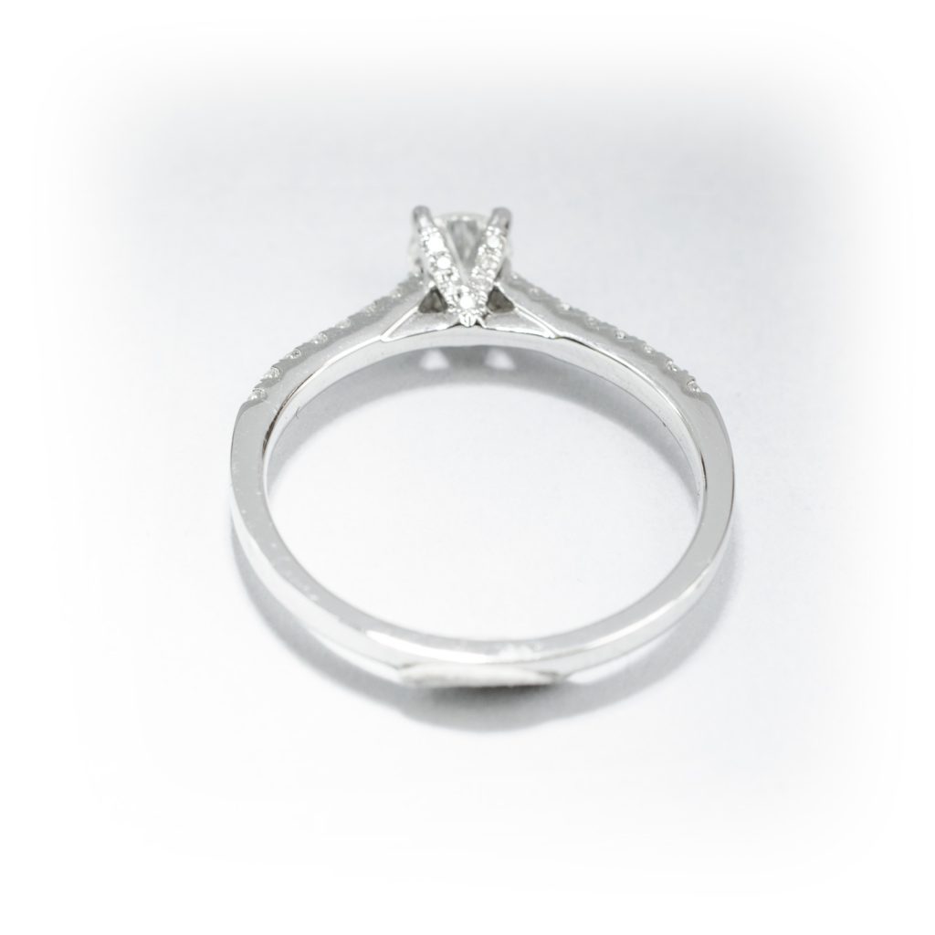 Es el momento de hablar de los diamantes que hacen deslumbrar esta joya; Esta sortija consta de un total de 31 diamantes en total, por una parte hay 16 diamantes en los brazos superiores todos en talla brillante, por otra parte deslumbran 7 diamantes por cada uno de los lados de las “V” que engasta la piedra central, estos 14 diamantes están tallados en brillante, y por ultimo y el mas importante e imponente, es el diamante central que resalta de todos los demás, dándole toda la importancia que se merece, este diamante también esta tallado en talla brillante, estas piedras tienen una calidad de VS2 y un color de H en la escala GIA, tienen un peso aproximado de 0,45 quilates en total.